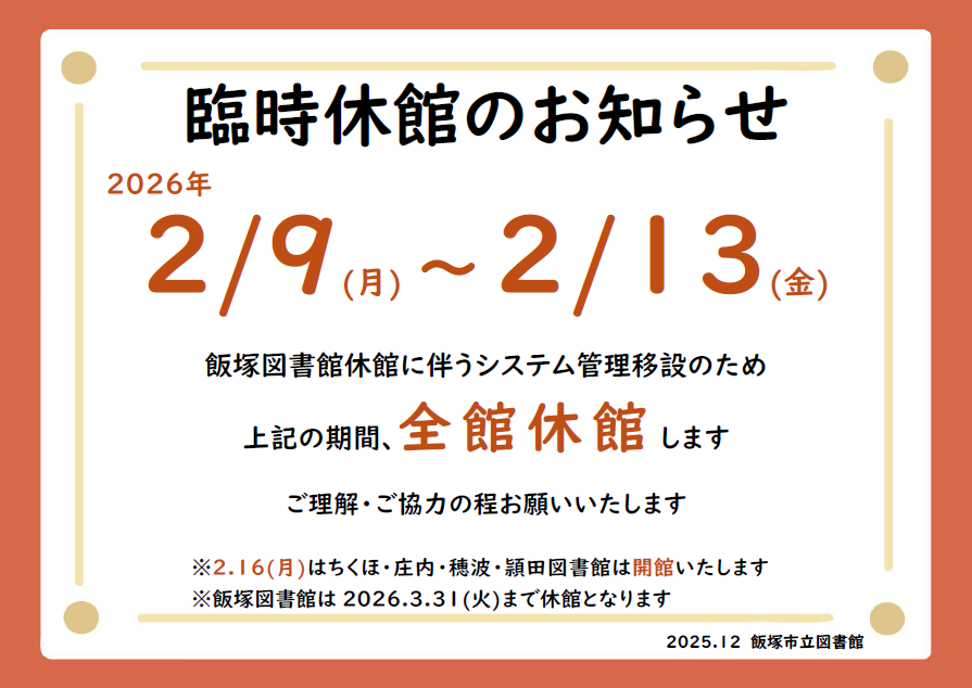 飯塚図書館休館に伴うシステム管理移設のため 臨時休館 します。